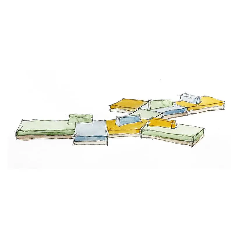 El sofá Pixel es la pieza central de esta colección y está compuesto por tres módulos independientes que permiten crear una amplia variedad de formas. Desde sofás lineales y chaiselongue hasta rincones acogedores e incluso una cama, Pixel se adapta a tus necesidades y a tu espacio, proporcionando una versatilidad única. Su sentada baja está diseñada para un uso íntimo, ideal para zonas de chill out y relajación.