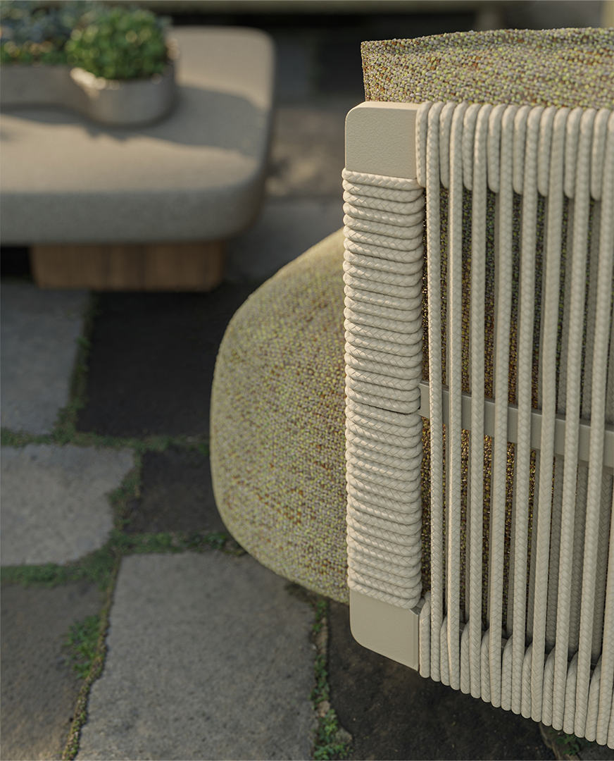 Diseñada por Jean-Marie Massaud para Vondom, Serra es una colección de mobiliario outdoor que envuelve el cuerpo como lo haría una hoja de plátano curvada por el viento: con naturalidad y sin esfuerzo. Su estructura de cuerdas tensadas —vertical, rítmica, artesanal— actúa como una celosía contemporánea que protege sin encerrar. En su interior, cojines generosos y sensuales invitan a dejarse caer.