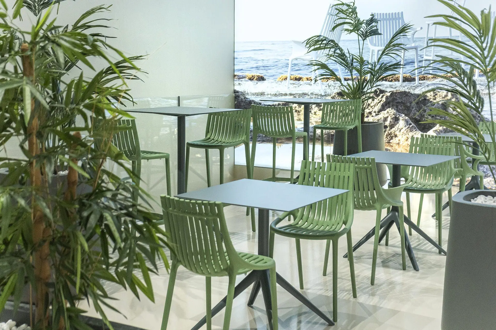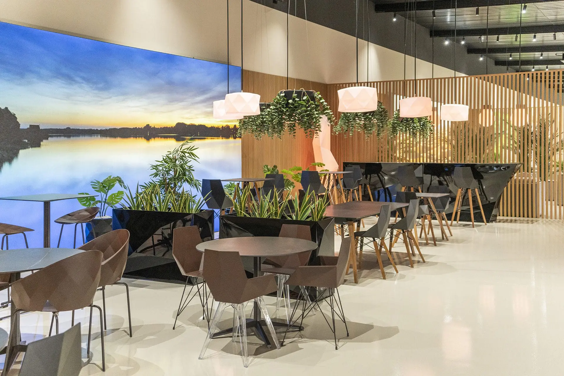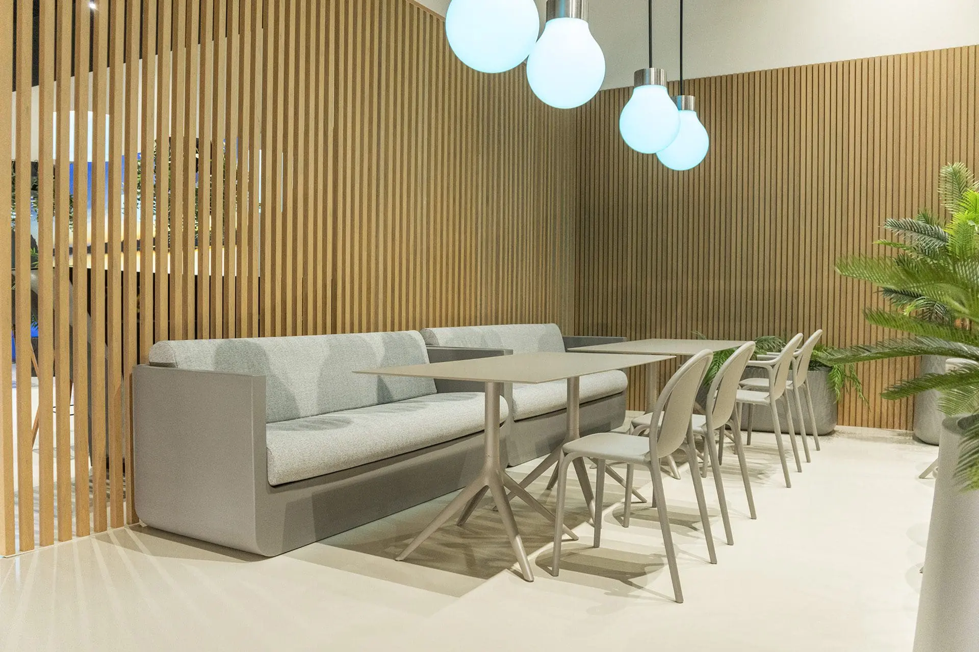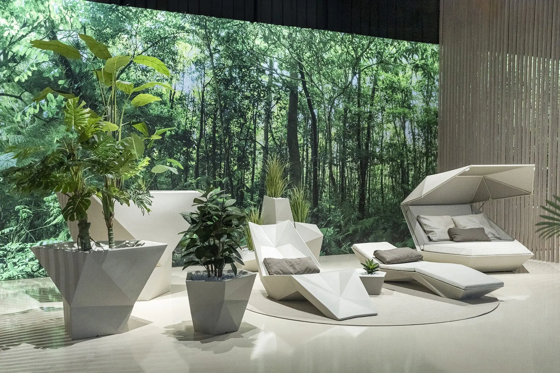 Por otro lado, en la segunda planta, con 750 metros cuadrados, sumérgete en la sofisticación y el estilo diseñados para proyectos comerciales. Explora nuestra gama de productos de polipropileno, ideales para el sector HORECA. Además, rinde homenaje a nuestros inicios con una colección de maceteros que realzan la estética de cualquier espacio hostelero.