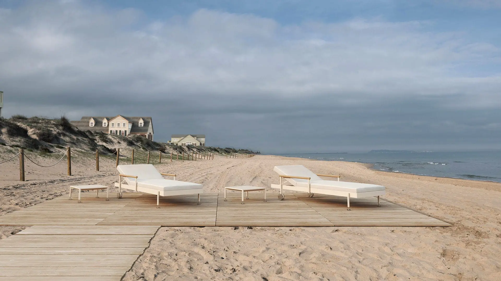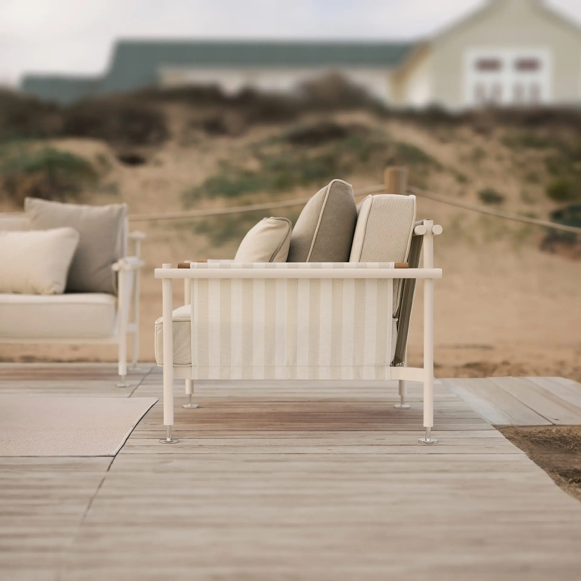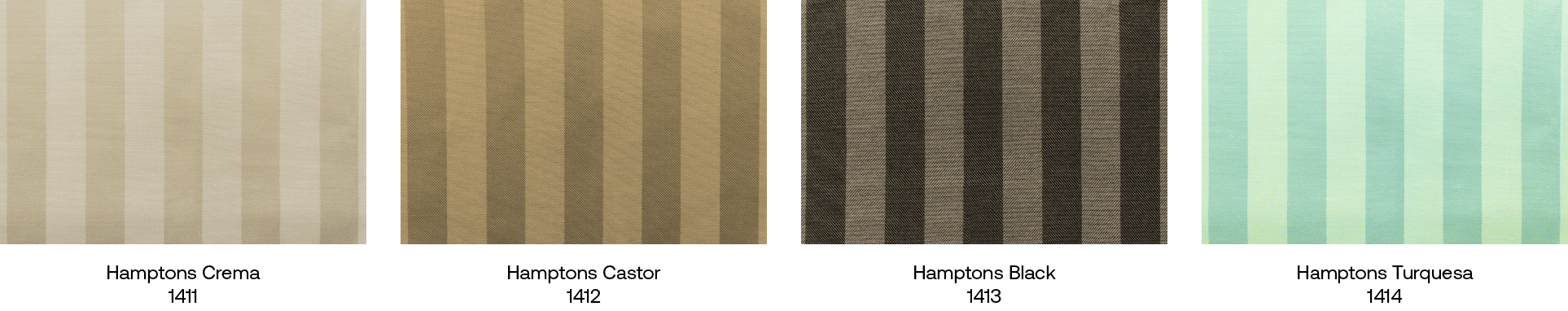 Hamptons ofrece una gama de muebles únicos, que incluyen la butaca, el sofá modular, la tumbona y las mesas bajas. Cada pieza ha sido diseñada meticulosamente, con una selección impecable de tejidos con patrones rayados que evocan el encanto de los Hamptons.