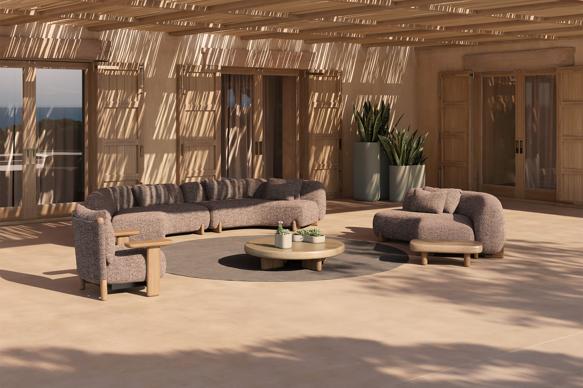 Las mesas de café representan la esencia del estilo lounge mediterráneo de la colección Milos. Estas mesas están fabricadas, presentando una superficie de cemento disponible en acabados distintos. Destacan por sus patas de madera de iroko, que no solo añaden un toque de calidez y sofisticación, sino que también aseguran la estabilidad y la conexión con la naturaleza característica de Milos.