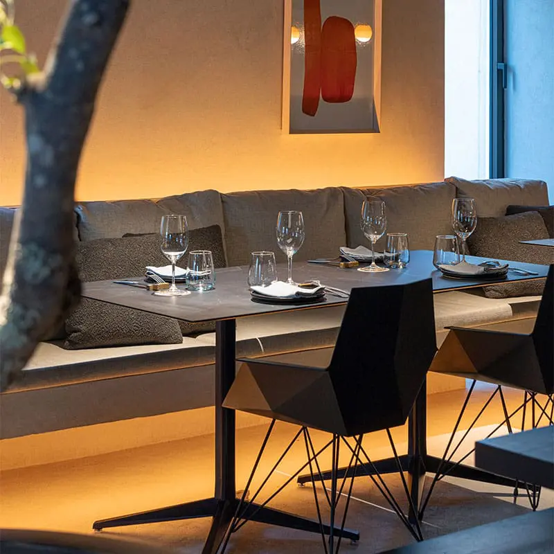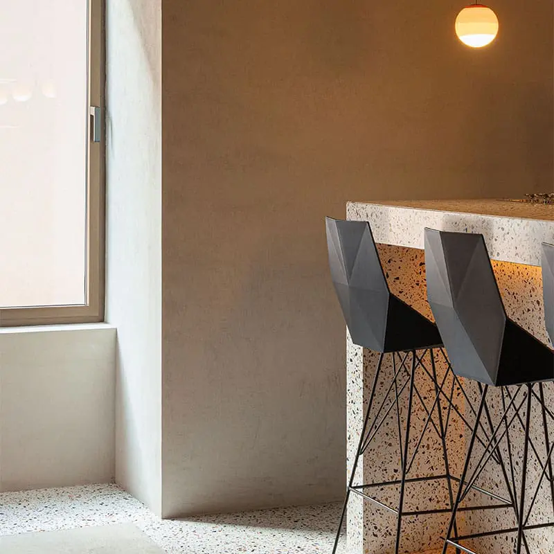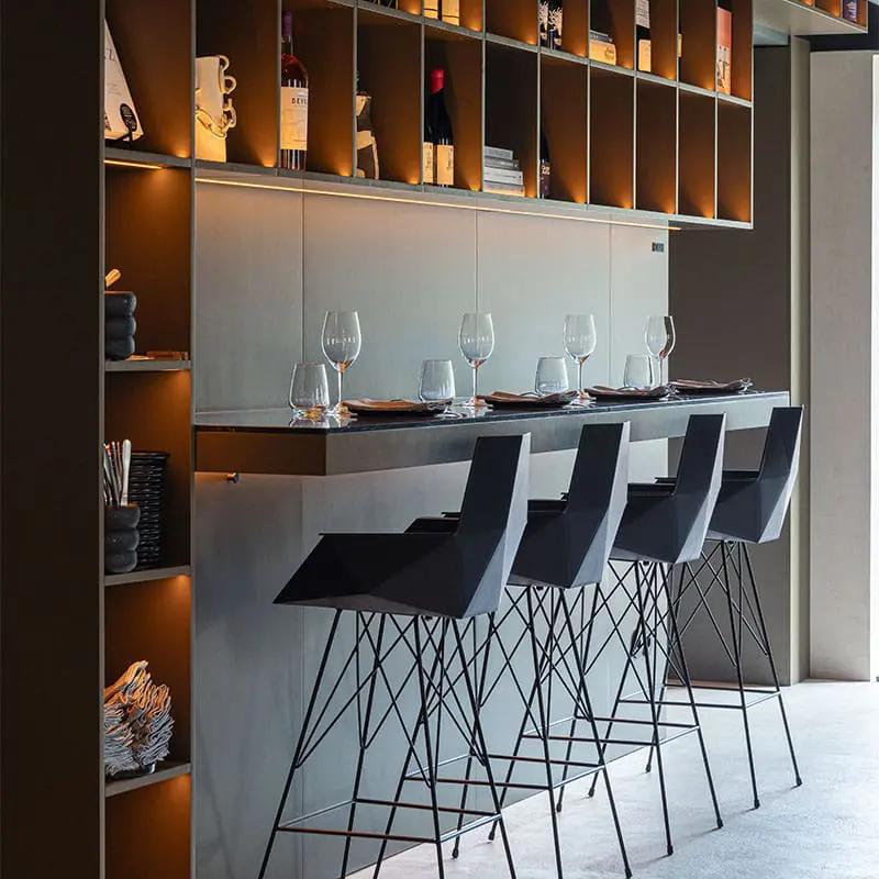 Las sillas y banquetas Faz de Ramón Esteve para Vondom refuerzan esa idea. Su silueta facetada capta la luz y ordena el conjunto; el asiento cómodo y el reposapiés estable invitan a permanecer. Son piezas ligeras y resistentes para uso intensivo, fáciles de limpiar y mover, con una presencia gráfica que define el espacio sin imponerlo.