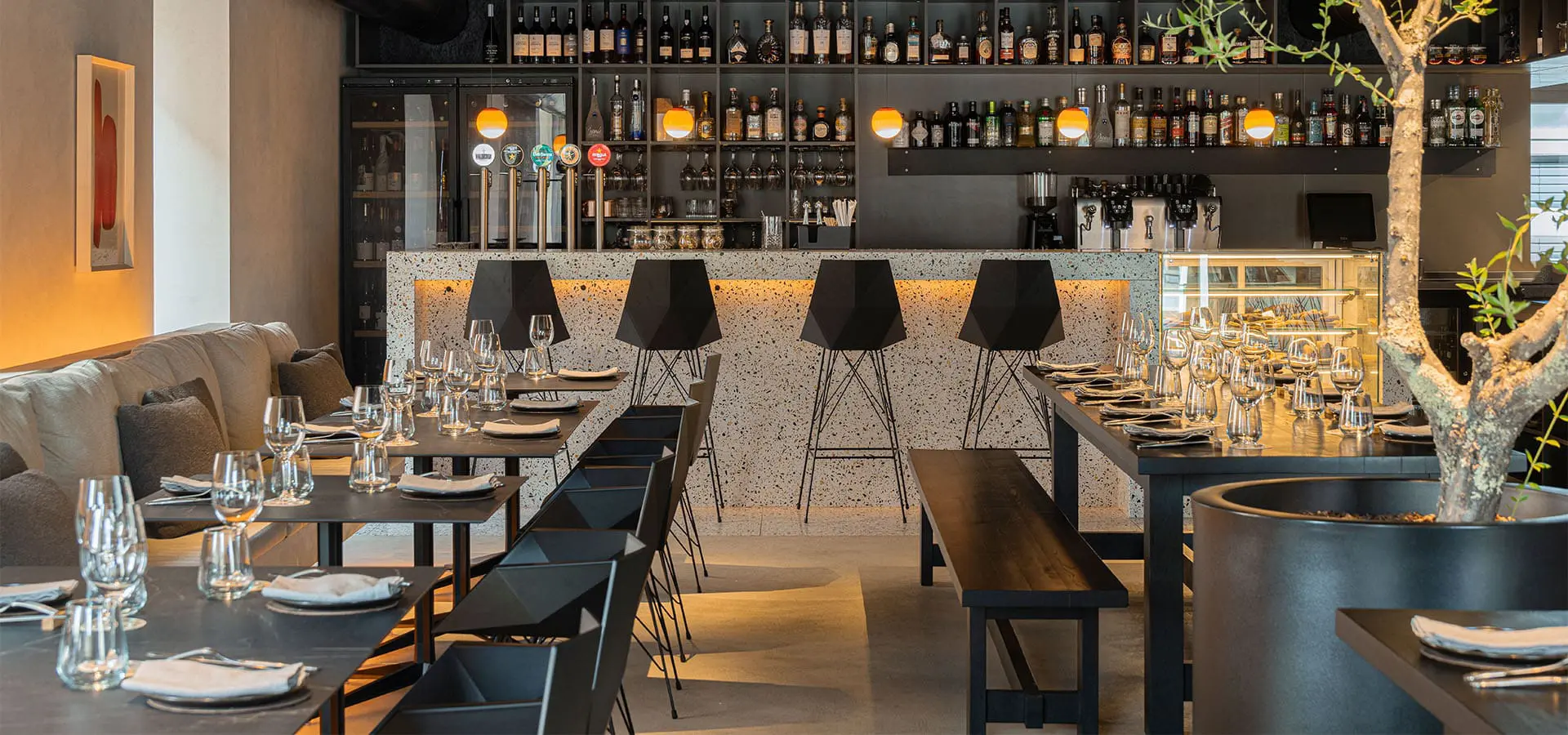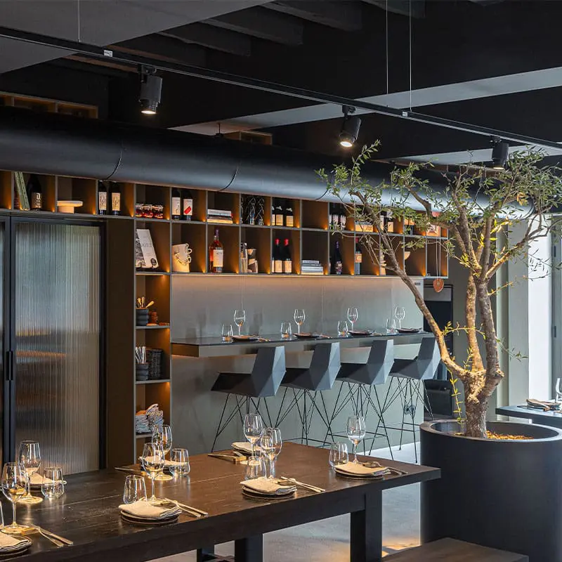 El proyecto apuesta por una atmósfera sobria y urbana: techos y conductos en negro, estanterías lineales y vidrio estriado que vela el fondo. La luz es baja y dirigida —líneas perimetrales y puntos de acento—, más de contraste que de calidez, para perfilar aristas y texturas. El terrazo del bar aporta vibración sutil; la madera aparece en notas discretas. Los maceteros Cilindro estructuran el verde en grandes volúmenes, introduciendo escala y un respiro natural sin romper la estética monocroma.