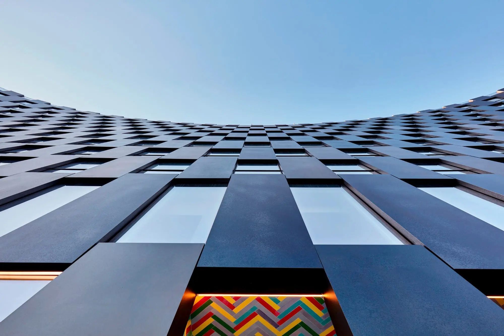 Los colores vivos forman parte de la arquitectura de este moderno edificio; incluyendo el mueble exterior de Vondom emplazado en lo más alto aportando diseño, vanguardia y diversión.