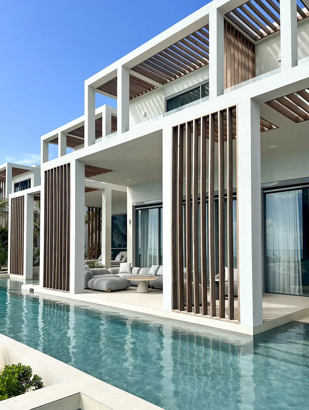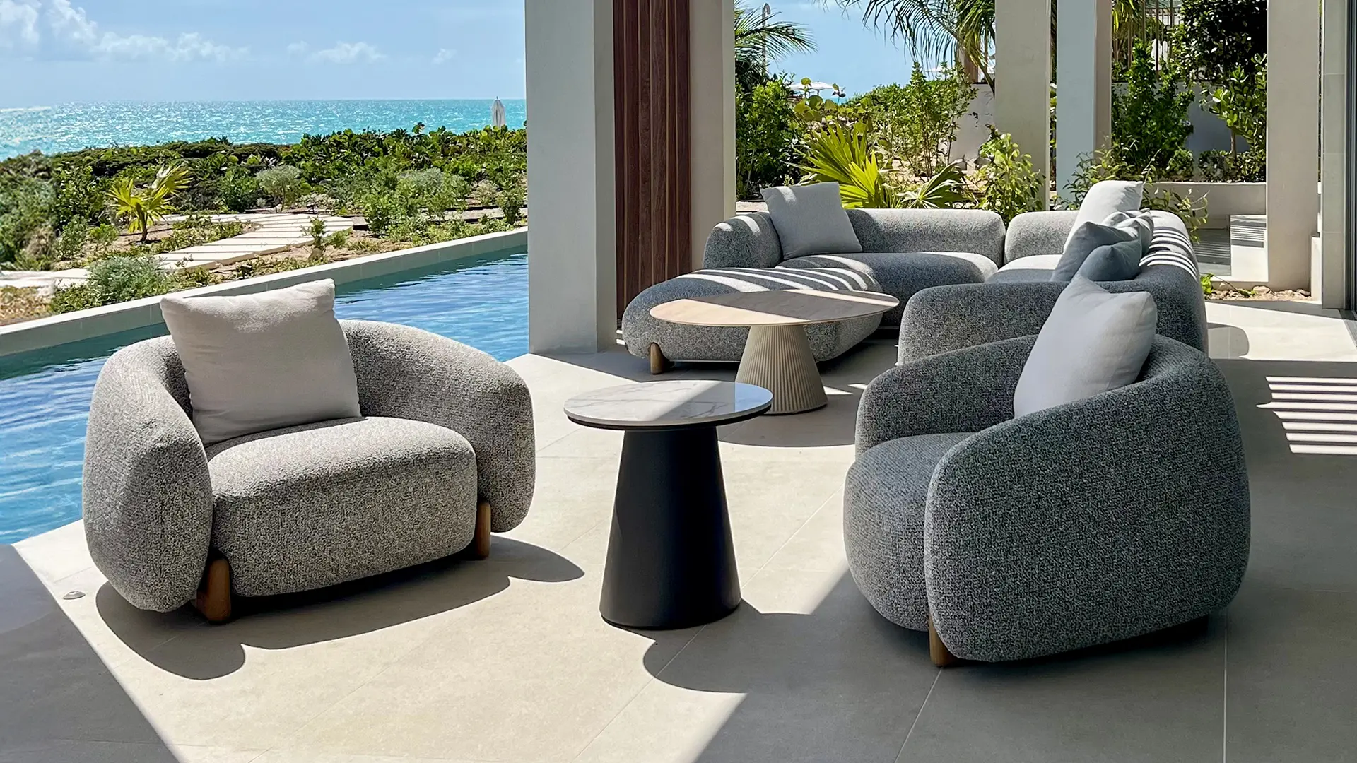 Diseñada para el encuentro de varias generaciones, el proyecto sitúa la experiencia compartida en el centro. El lounge exterior se convierte en el corazón de la villa, equipado con la colección Milos, cuyas proporciones generosas y materialidad serena favorecen el confort y la convivencia.
