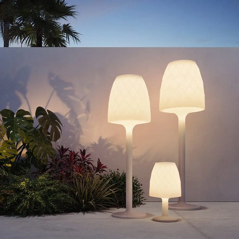 Similarly, Blanca, by Javier Mariscal, adds a subtle and graphic design option, ideal for outdoor spaces where a warm lighting effect is sought, creating a welcoming and contemporary atmosphere. It is a piece that manages to convey personality in its simplicity and offers a light that integrates harmoniously into sober, modern spaces.