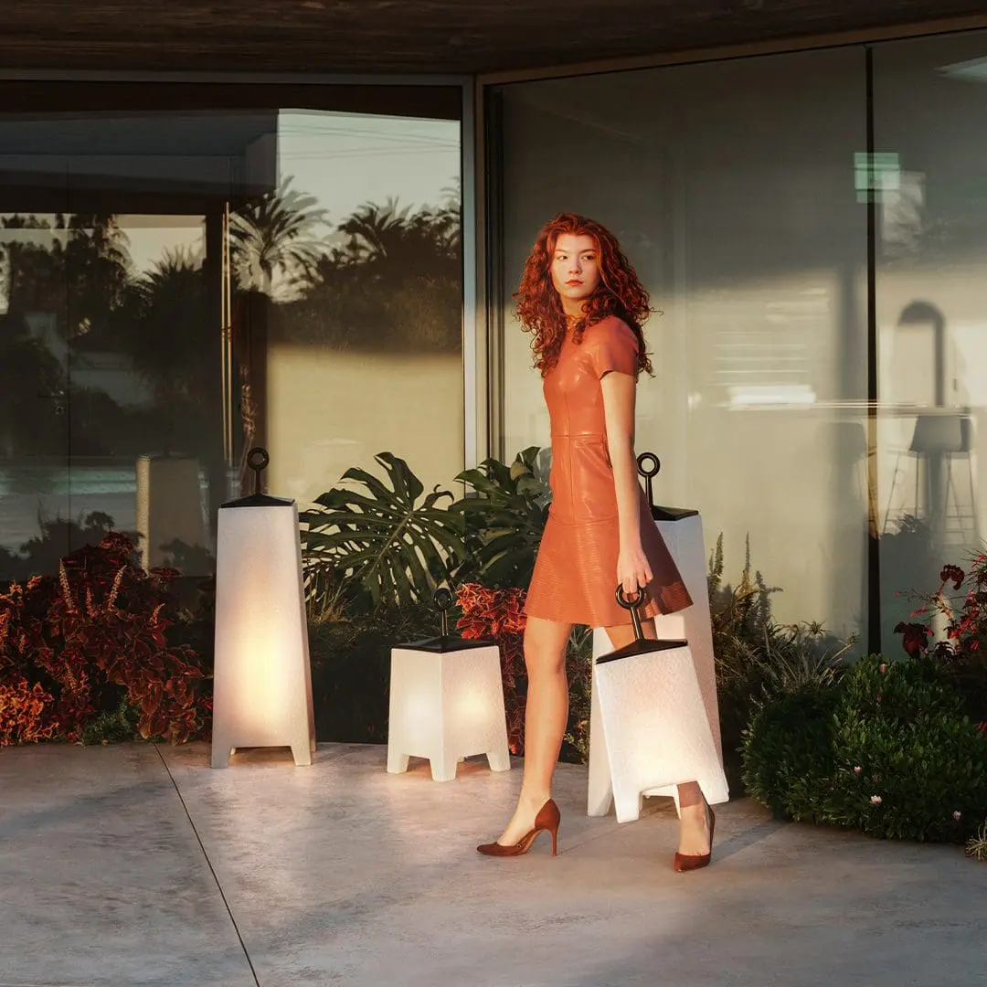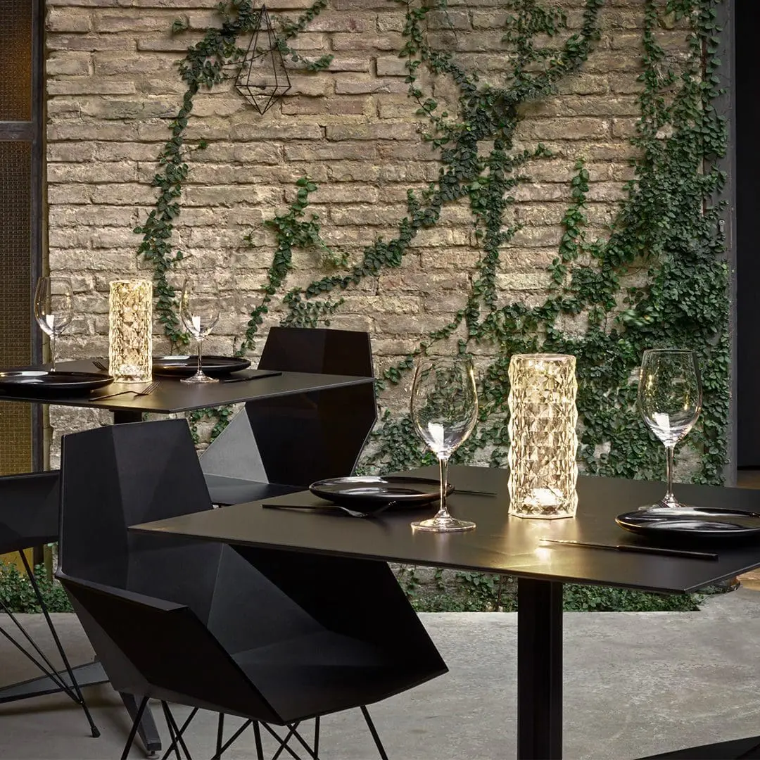 The Marquis table lamp, meanwhile, is ideal for those looking to add a touch of refinement to outdoor lighting. Inspired by the cut of diamonds, this table lamp stands out for its geometric facets that reflect the light in a subtle way, projecting sparkles that evoke the sparkle of a precious stone.