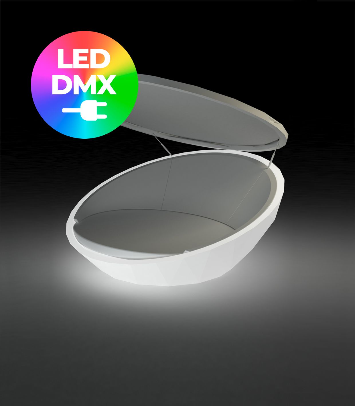 Unit with internal lighting with RGBW LED technology and remote control unit for switching colors. Also controlLED by DMX-1024 (wireless), enabling communication between one or more products simultaneously via the DMX transmitter (not included). There are two options to choose from: Professional XLR DMX and Home WIFI DMX. (Remote control included). Optional battery