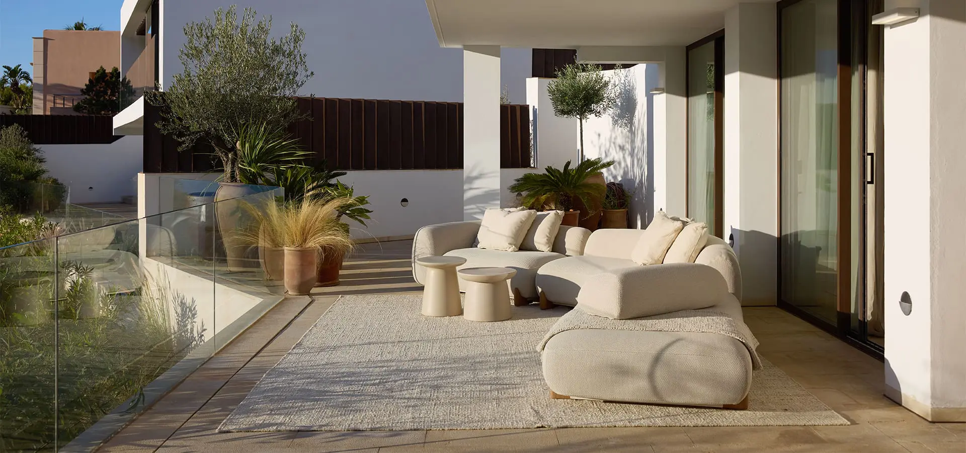 Here, curves take the lead: rounded armrests, enveloping seats with wooden legs that add sensory warmth. The natural palette — light woods and soft-touch fabrics — brings the terrace closer to the comfort of a living room, while maintaining outdoor performance and a serene presence that matches the rhythm of the island.