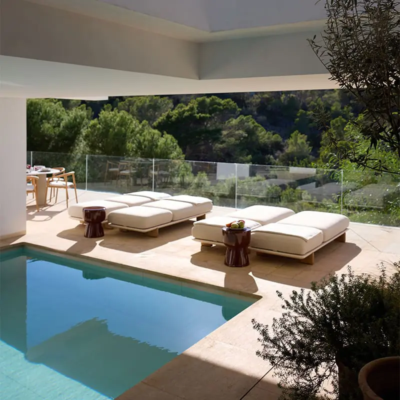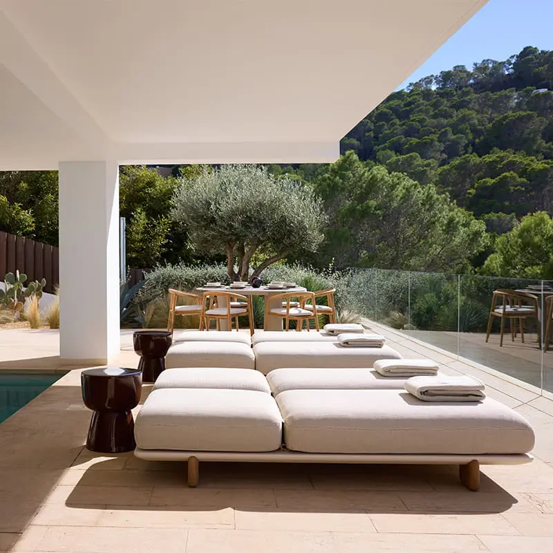 By the pool, the Milo sun loungers take comfort to another level: generous surfaces, padding that yields just enough, and ergonomics that support the body from reading to napping. The materials are designed for intensive use by the sea: easy maintenance, UV resistance, and color stability. A set that withstands sun, salt, and everyday life without losing its scenic presence.