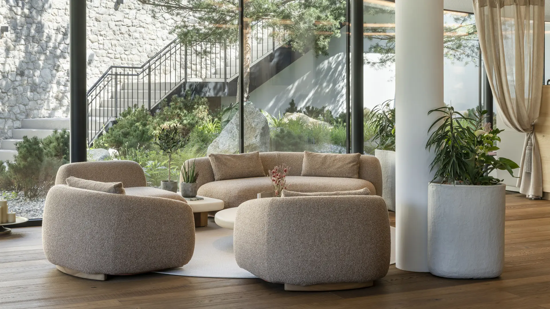 Across its terraces and lounge areas, the Milos collection, designed by Jean-Marie Massaud, introduces a calm, architectural presence. Its generous volumes, inspired by geology and natural erosion, engage effortlessly with the mountain setting. Milos does not compete with the landscape — it moves with it.