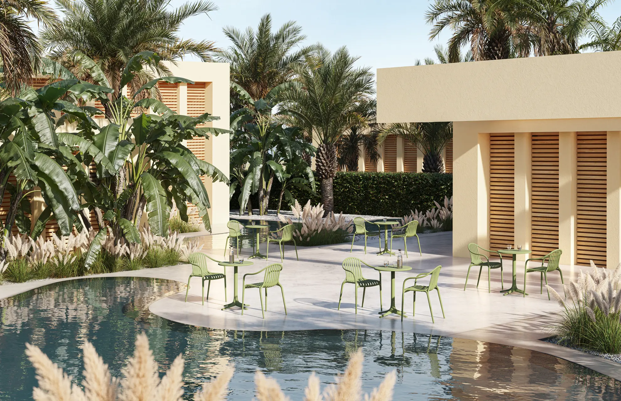 Palm is designed for high-traffic outdoor spaces—hotel terraces, restaurants, and pool bars that demand scale and flexibility. Injected polypropylene resists sun and rain; the open lattice ventilates and drains. Lightweight and easy to handle, it lets you reconfigure the space in minutes without losing comfort or natural character.