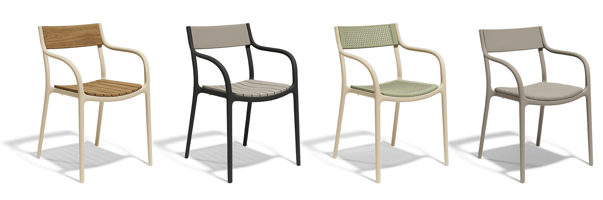 The collection revolves around a single structure, capable of displaying different personalities. One of them stands out for its resin slats with a timeless air, while another has a lighter look that radiates freshness. There is a classic and cosy option, designed for those who are looking for a seat with a soft touch, and the last one uses an innovative material that evokes the warmth of wood.