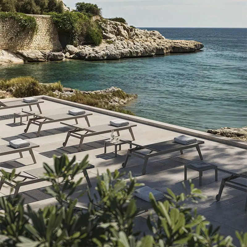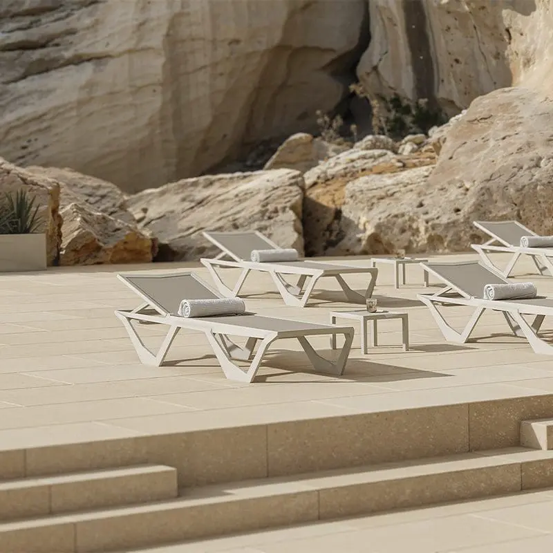 Ramón Esteve rescues the geometric elegance of Art Deco and translates it into Gatsby, a lounger that combines straight lines and precise angles. The result is a piece that meets the expectations of the contemporary guest: quick-drying, firm support, and easy handling.