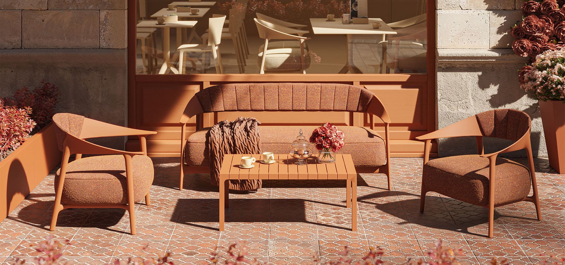 The lounge chair (65049F) and 2-seater sofa (65091F), presented in Clay lacquered structure with Fisterra Clay upholstery, are the soul of this setting. Both versions can include optional backrest padding, adding extra comfort for those long, relaxed outdoor conversations where time seems to stand still.